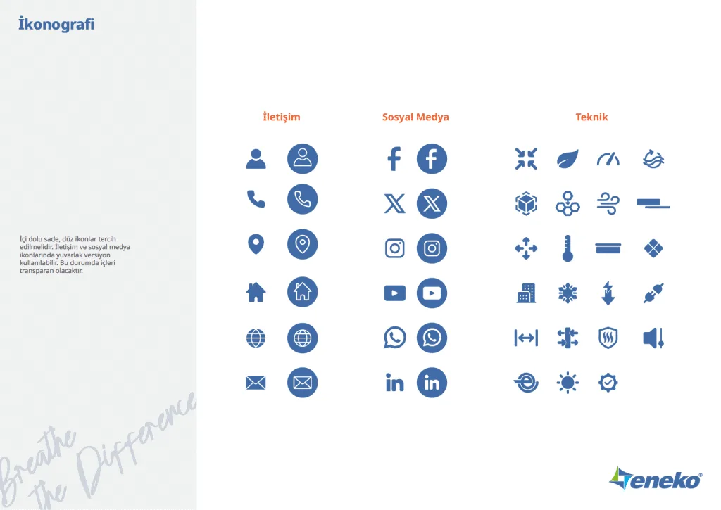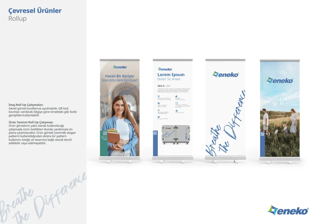 Rakiplerine göre çözüm odaklı yaklaşımı ve özel projeler için esnek üretim kabiliyeti nedeniyle yarattığımız ‘‘Breathe the Difference – Farkı Soluyun’’ sloganın görsel çalışmaların arkasında bir iz/patern olarak kullanıldığı kurumsal kimlikten ilerlenmesine karar verildi. Sloganın el yazısıyla özgün ve hareketli kullanımı, modern görsel diliyle birlikte Eneko’yu dinamik, esnek, yenilikçi ve pazarda benzeri olmayan dikkat çekici bir marka haline getirilmesinin ilk adımını attık ve farkımızı hedef kitlenin aklına kazımak için yola çıktık. Eneko yeni yüzüyle ilk olarak Frankfurt’ta gerçekleştirilen ISH 2025 Fuarı’nda Avrupa’da hedef kitlesiyle buluştu ve tüm dikkatleri üstüne topladı.