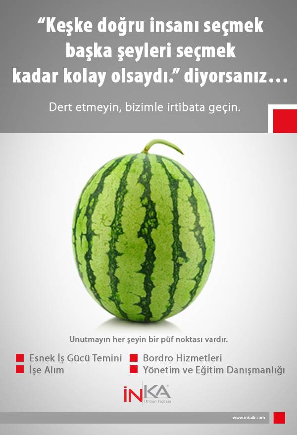 Yaz Geldi, Karpuz Kabuğu İlanlara Düştü Türkiye’nin yüzde yüz yerli en iyi insan kaynakları firması olma yönünde emin ve oldukça cesur adımlarla ilerleyen İNKA için, kendisini rakiplerinden farklılaştıran çalışmalarımız devam ediyoruz. Müşterimizle gerçekleştirdiğimiz toplantıda İNKA yetkilileri, doğru personel seçmenin zorluğunu ve bu işlemin uzmanlara bırakılması gerektiğini vurgulayacak, elbette farklı bir anlatım tarzı ile dikkat çekecek […]
